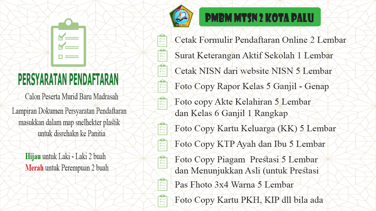 MTsN 2 KOTA PALU menyediakan PMBM secara online diharapkan proses PMBM dapat berjalan cepat dan bisa dilakukan dimanapun dan kapanpun selama sesi PMBM Online dibuka. MTsN 2 KOTA PALU.
